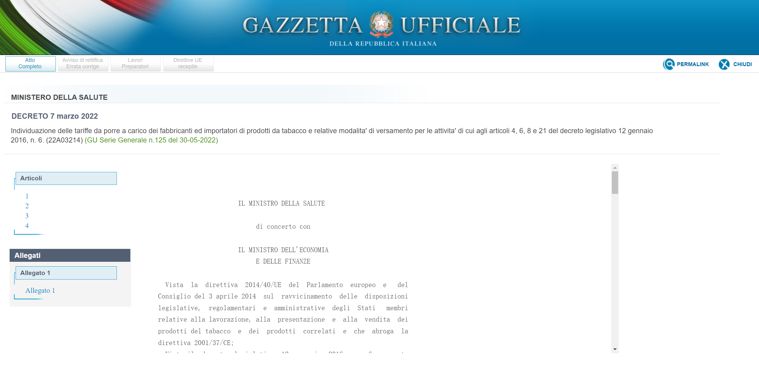 近期,意大利在其官方公报上公布法令“DECRETO 7 marzo 2022”。鉴于意大利卫生部在监管烟草产品的合规性时,意大利政府承担了高额的分析、测试、管理等费用,现制定本法案,要求烟草产品的进口商和制造商来承担此部分费用。具体如下: